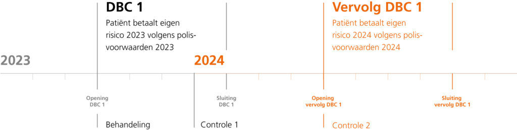 Stel dat een vervolg-dbc eind januari 2024 wordt geopend. Je krijgt dan nog een nacontrole. Dan moet je ook voor 2024 uw eigen risico betalen. Want de startdatum van deze vervolg-dbc bepaalt over welk jaar je het eigen risico betaalt. En dat is in dit voorbeeld 2024.